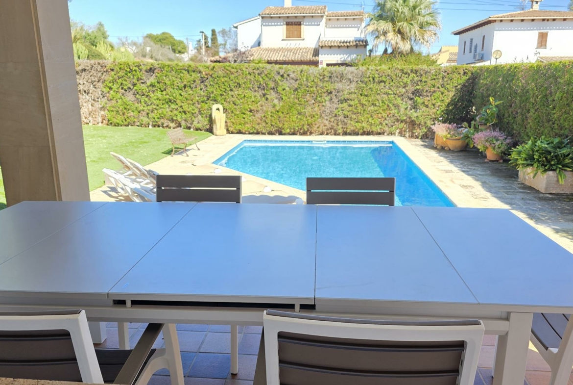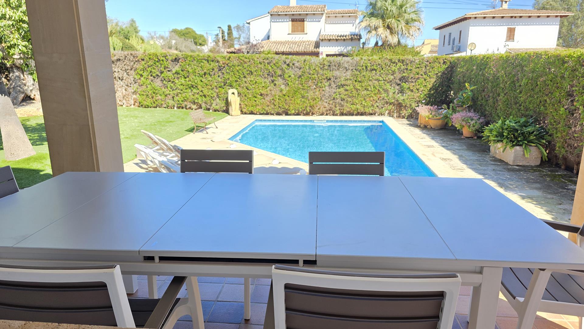 Piscina privada al aire libre, mobiliario de jardín, tumbonas y barbacoa.